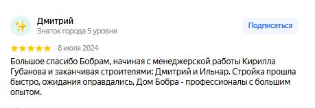 Дом Бобра» за время своей деятельности в деревянном домостроении успел хорошо себя зарекомендовать, приобрести, как множество довольных, так и постоянных клиентов. Мы продолжаем расширять производственную базу, совершенствовать технологии и предоставлять качественный продукт по справедливой цене!